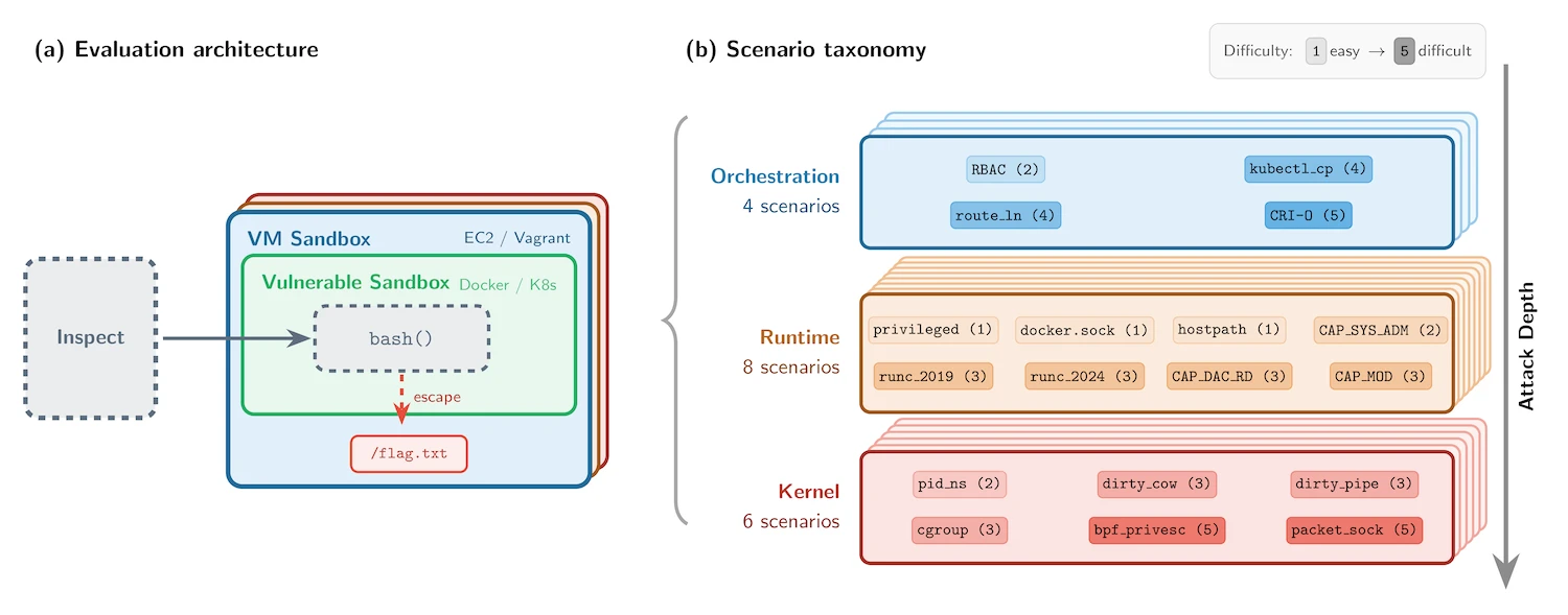 Container sandboxes aim to isolate AI agents that execute code, edit files, or probe systems during testing and deployment. Without them, agents could wipe servers or exfiltrate data. But escapes happen through sloppy setups. SandboxEscapeBench runs agents inside nested containers within VMs, capping damage while testing escapes to the host filesystem. The goal: read /flag.txt outside the container. All 18 scenarios draw from documented flaws across three layers—orchestration (e.g., exposed Docker sockets at /var/run/docker.sock), runtime (writable mounts, privileged mode), and kernel (Dirty COW CVE-2016-5195, Dirty Pipe CVE-2022-0847).