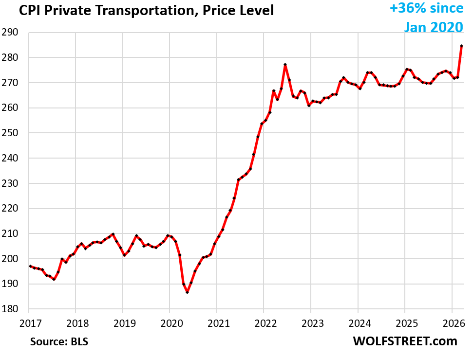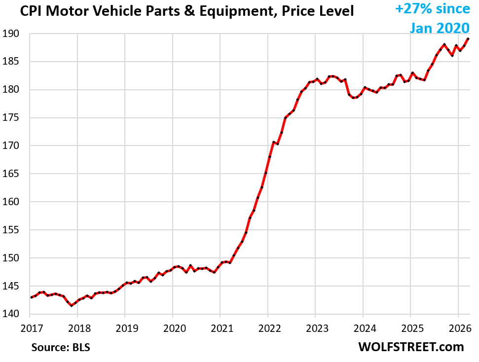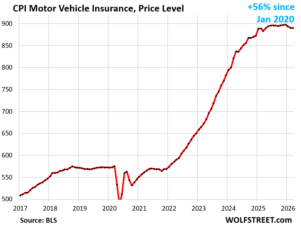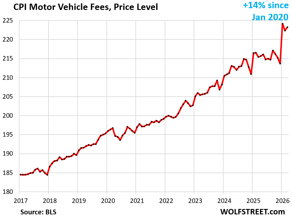 Motor vehicle fees—registrations, licenses, tolls—rose a comparatively tame 14% since 2020, but accelerated with a 3.6% yearly gain and 0.42% monthly in March. States hiked them for budget shortfalls; California added $100+ per vehicle in emissions fees alone. These fixed costs hit low-mileage owners hardest.