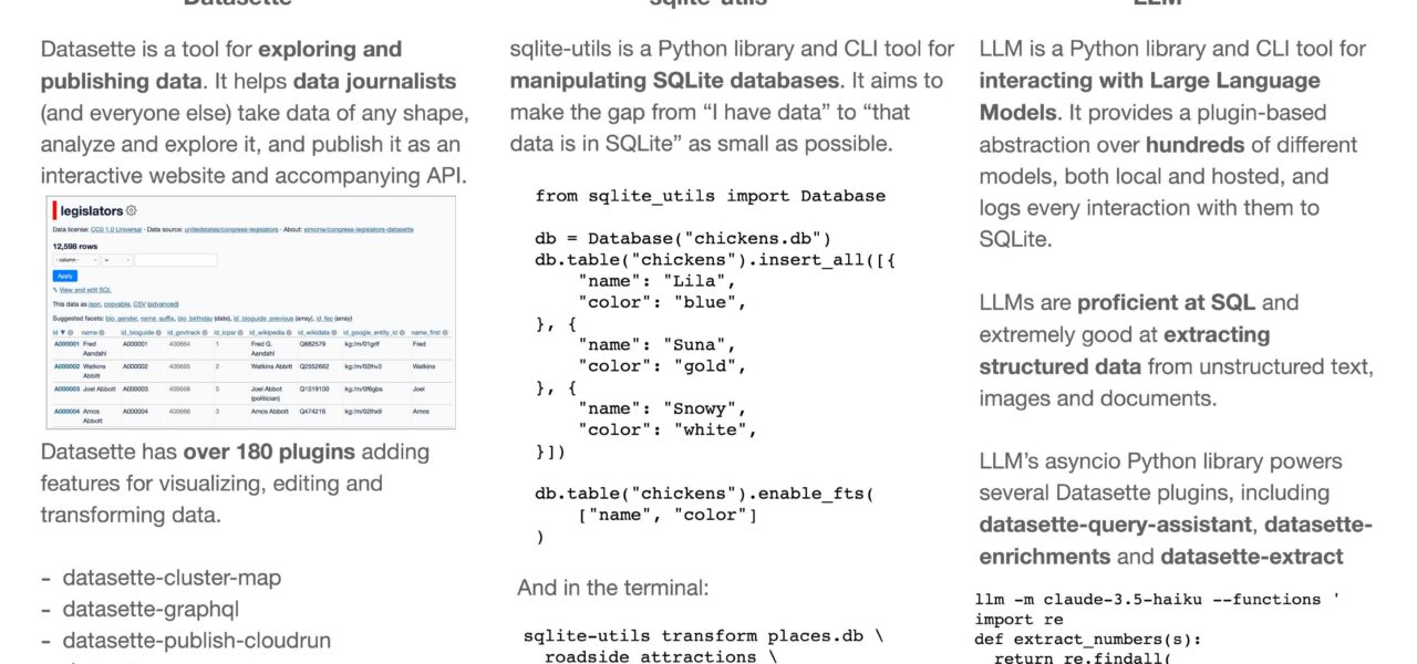 Datasette powers lightweight data apps without heavy frameworks. You load a SQLite file, run datasette project.db, and get faceted search, SQL queries via UI, and plugin extensibility. With over 200 plugins, it handles everything from geospatial viz to API endpoints. datasette-llm, released in mid-2024, embeds LLM inference directly—supporting Ollama for local runs, OpenAI, Anthropic, or Grok APIs. No data leaves your server if you choose open models like Llama 3.1.