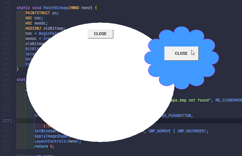 Custom shapes start with CreateWindowEx and flags like WS_EX_LAYERED for per-pixel alpha or SetWindowRgn for region-based clipping. Regions derive from paths, bitmaps, or primitives.