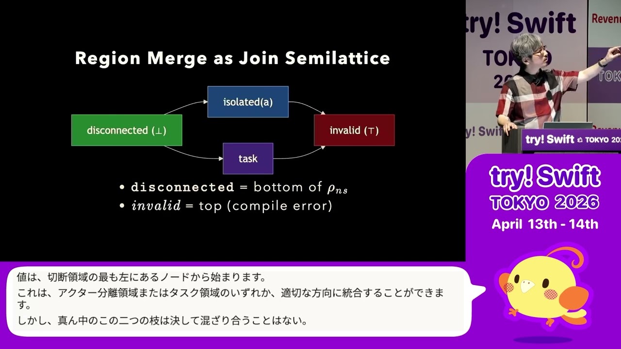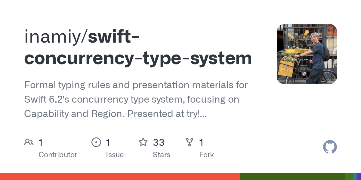 Swift 6.2 introduces a formalized concurrency type system centered on Capabilities—defining where code executes—and Regions—specifying where data resides. Developers Kazunobu Inamiy presented this at try! Swift Tokyo 2026, releasing slides, a paper, and typing rules that dissect the mechanics. Watch the video at youtu.be/Vs_hytYk3HU, or view HTML slides at inamiy.github.io/swift-concurrency-type-system/slide.html and PDF at speakerdeck.com/inamiy/swift-concurrency-type-system.