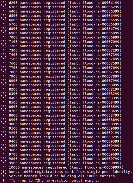 Then flood it with a client registering 10,000 namespaces like flood-00000000 to flood-00009999: