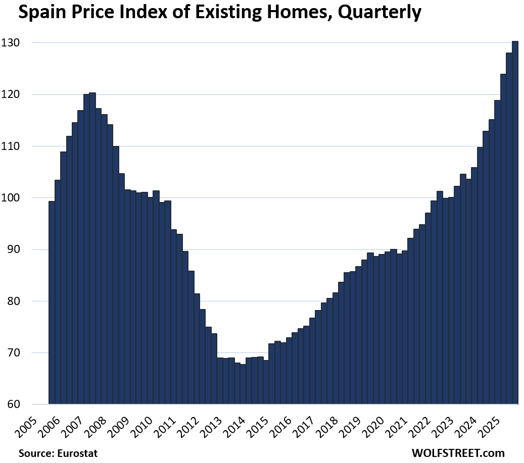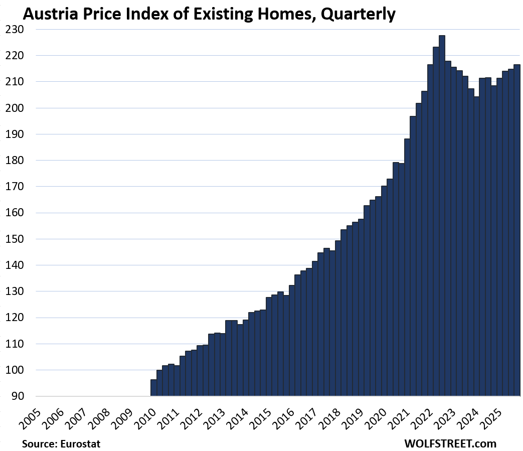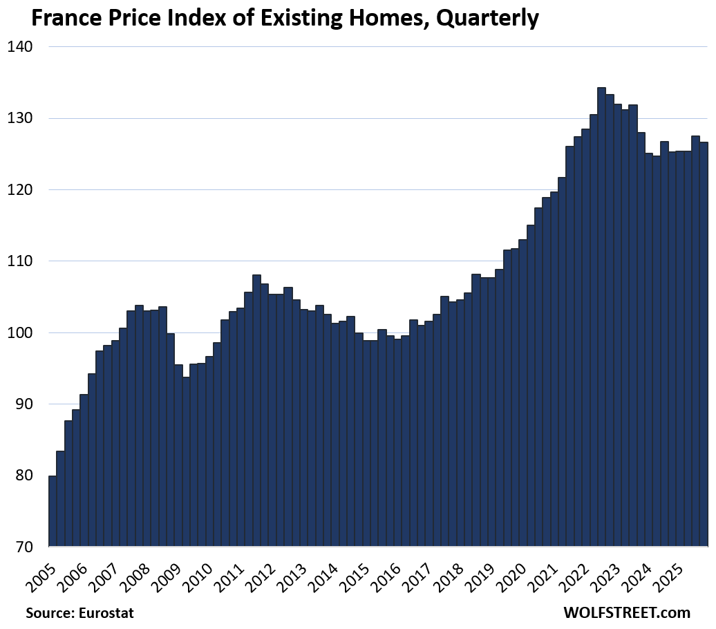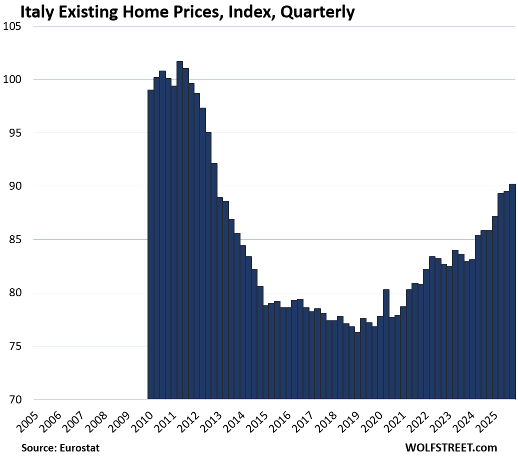 Six countries lag prior highs. Finland leads the fall: down 1.2% quarter-over-quarter (QoQ) in Q4, now matching 2010 after a brutal 2022 peak. Weak exports and high rates crushed demand. Italy remains 11.3% under its 2011 bubble top—despite 5.1% YoY gains lately—tied to chronic stagnation and youth exodus.