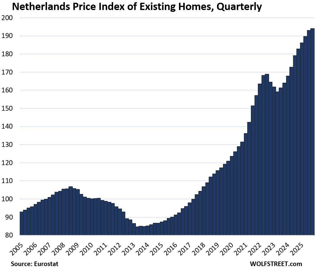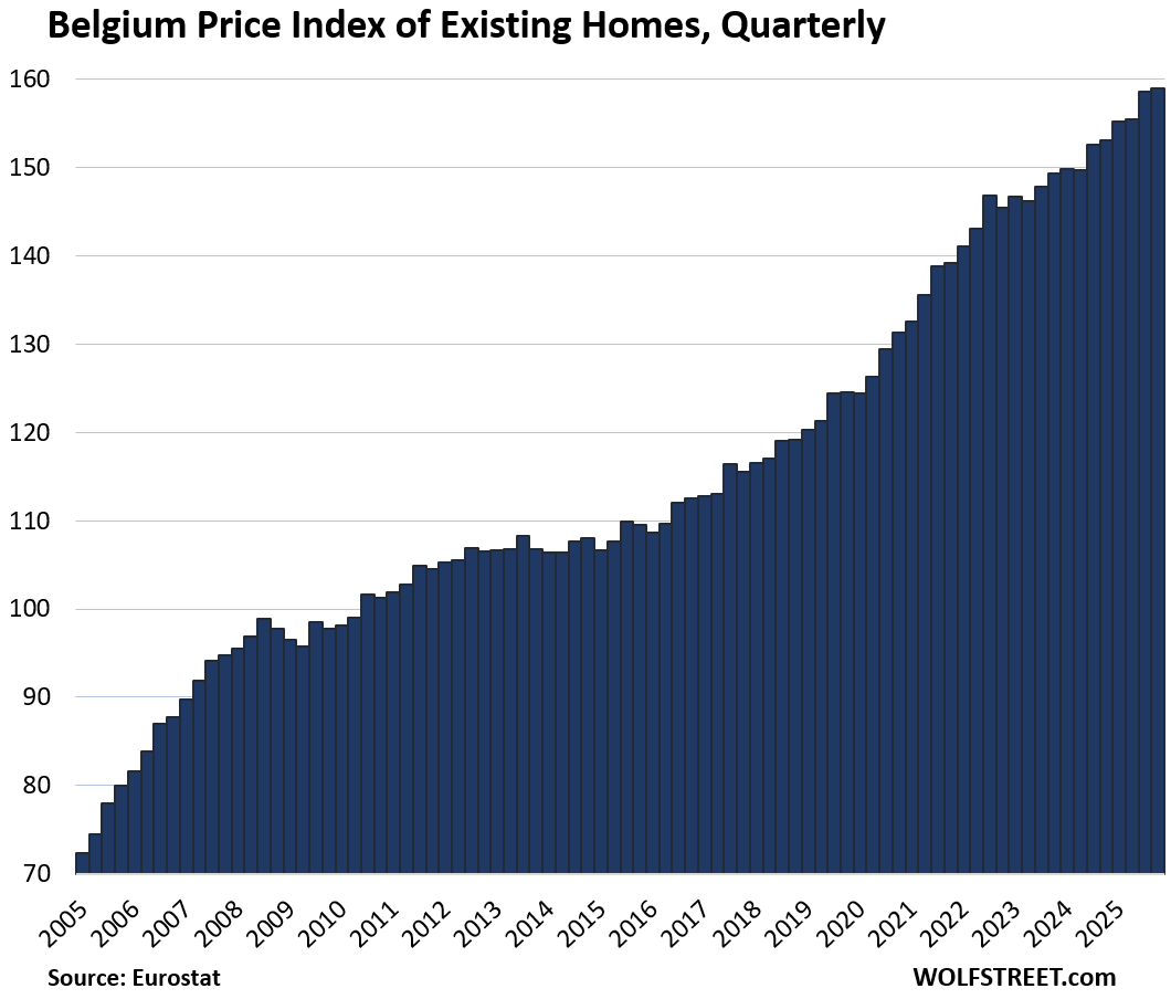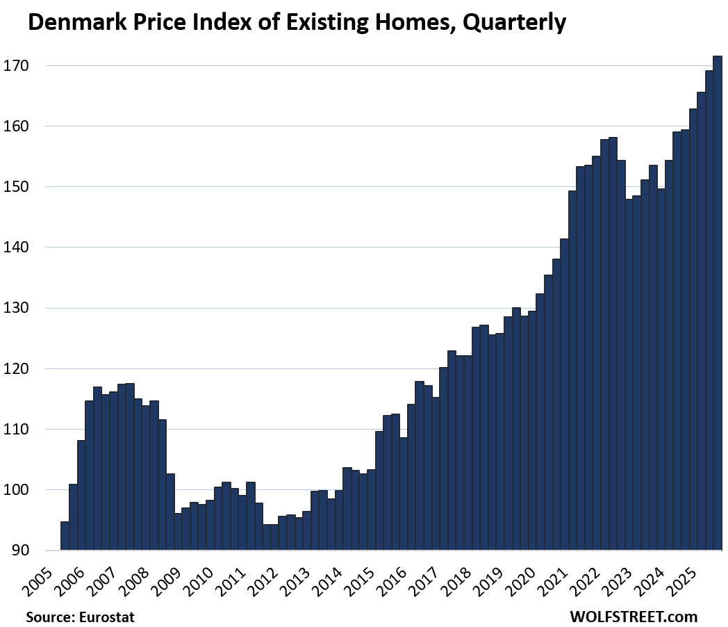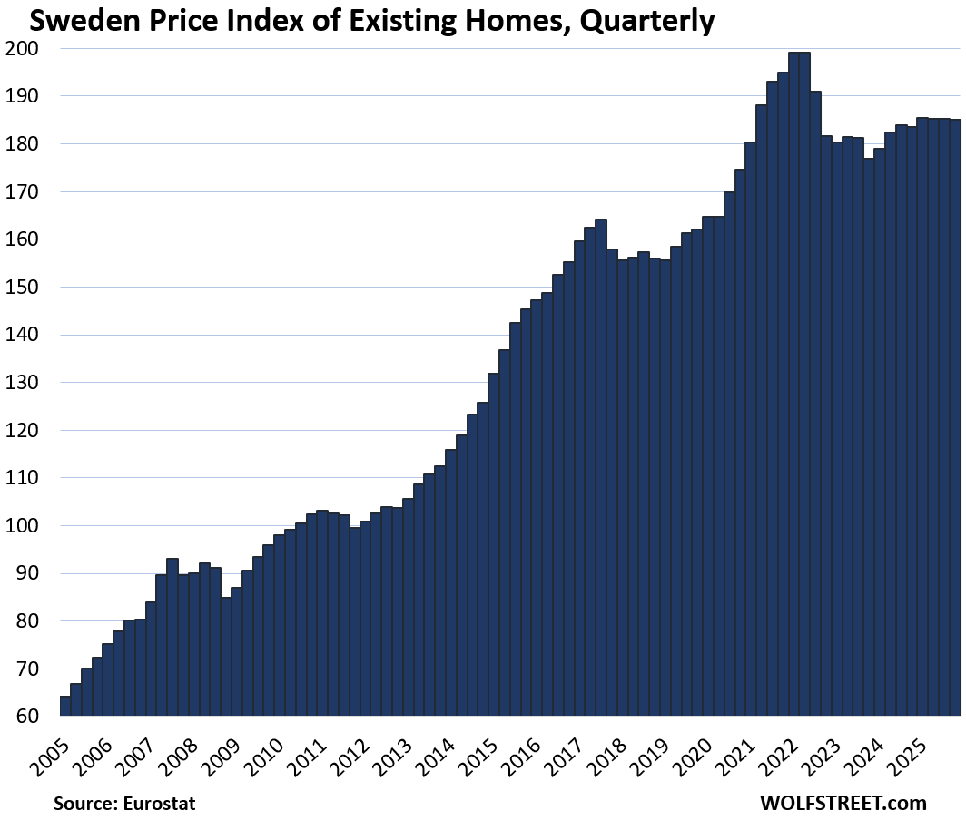 Six countries lag prior highs. Finland leads the fall: down 1.2% quarter-over-quarter (QoQ) in Q4, now matching 2010 after a brutal 2022 peak. Weak exports and high rates crushed demand. Italy remains 11.3% under its 2011 bubble top—despite 5.1% YoY gains lately—tied to chronic stagnation and youth exodus.