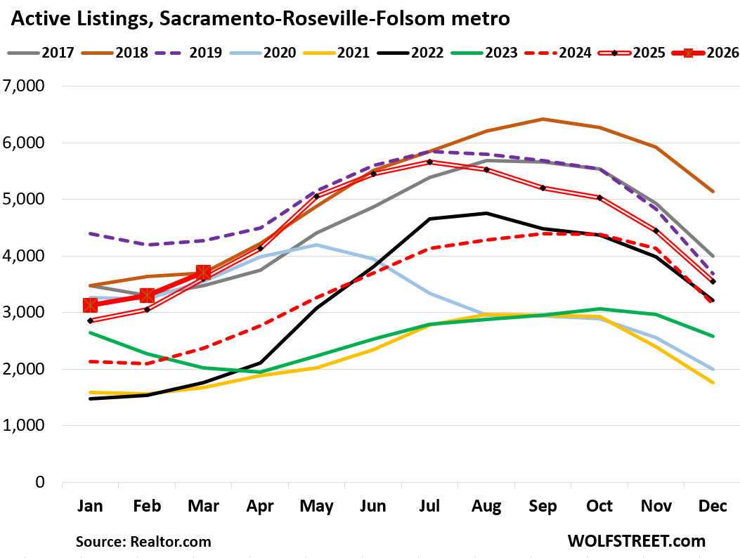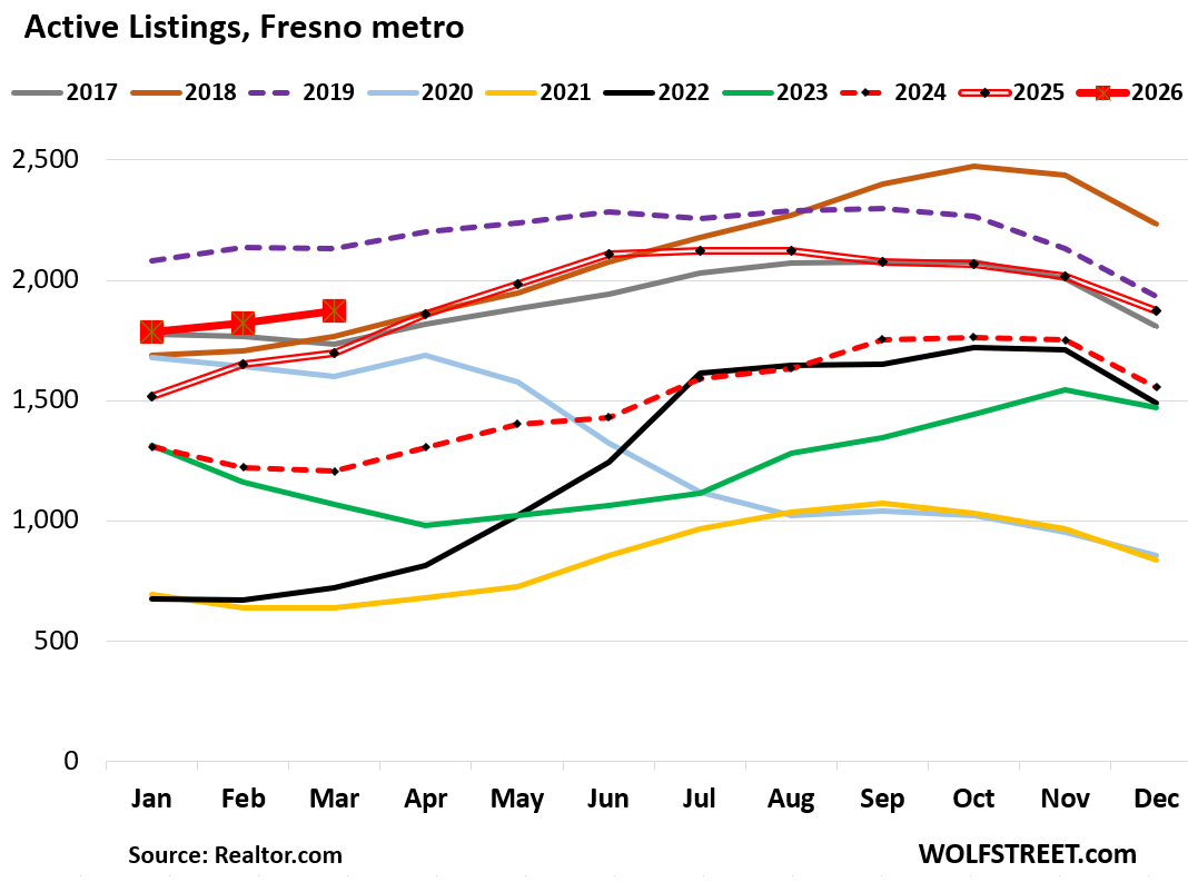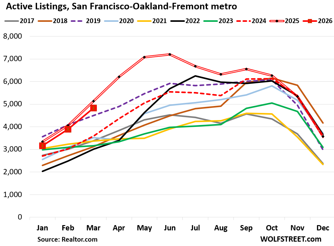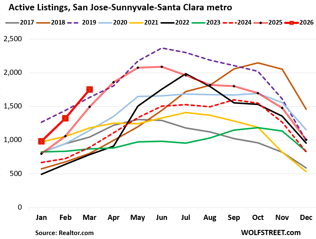 San Jose-Sunnyvale-Santa Clara metro (southern Silicon Valley) set a March record: 1,753 active listings. That’s 17% above March 2023 and 97% over March 2022. This area covers Santa Clara and San Benito counties, blending tech hubs with rural edges.