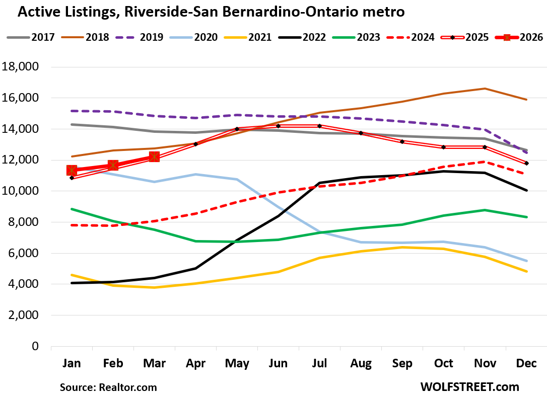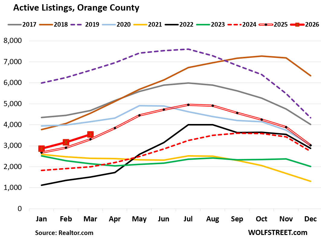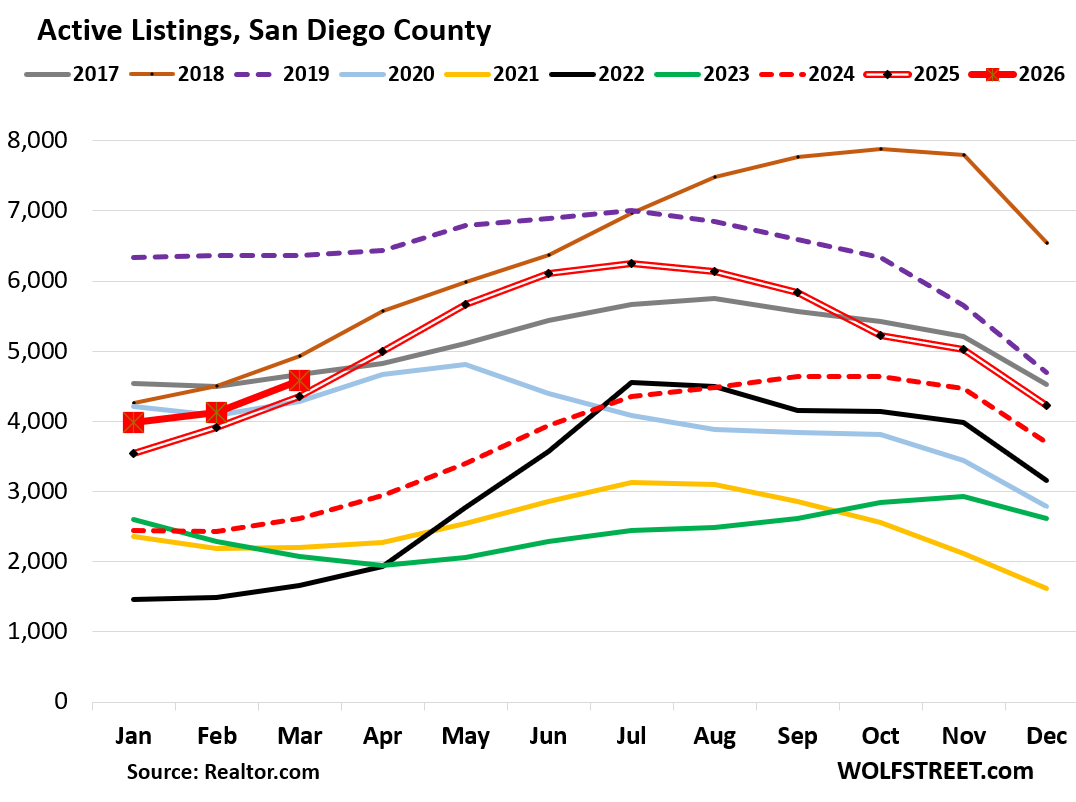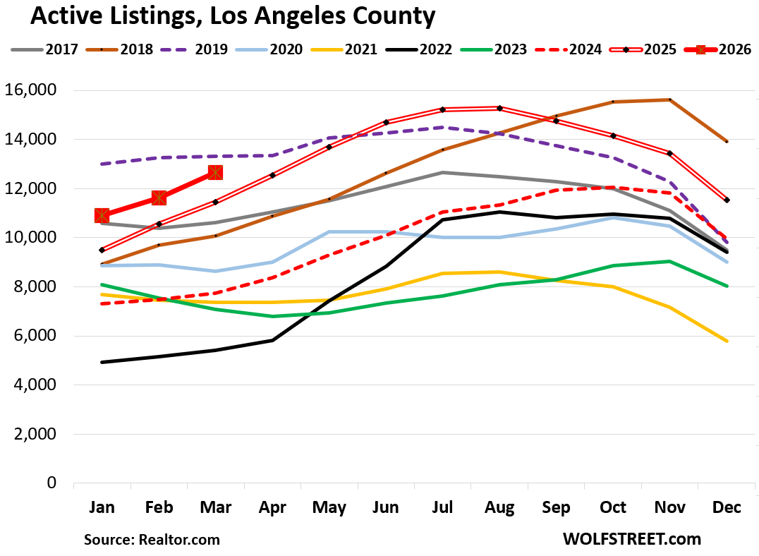Los Angeles County followed with 12,647 listings—second-highest March in 10 years, trailing only 2019. Up 10% year-over-year and 63% from two years prior.