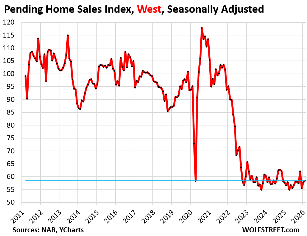 Realtor.com data, stretching back to mid-2016, shows listings up 5% from March 2023, 57% from March 2022, and 105% from March 2021. Pending sales in the West already lagged 33% behind 2019 levels by February. March crushed demand further: mortgage purchase applications plummeted.