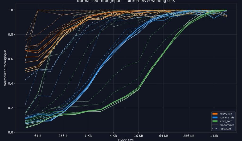 Modern CPUs demand linear memory access for peak performance, but block size matters less than you think. On a Ryzen 9 7950X3D, 1 MB blocks deliver full speed for most high-performance compute workloads. Drop to 128 KB blocks when your kernel chews through data at 1 cycle per byte or faster. Even 4 KB blocks work if processing takes 10+ cycles per byte. These sizes amortize the cost of jumping between blocks, letting you use chunked data structures without slowdowns.