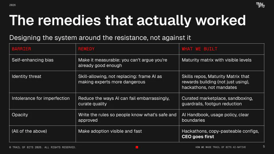 Resistance was fierce initially. Tech adoption research pins failures on people, not tools—status quo bias, fear of obsolescence, sunk costs in old methods. Trail of Bits countered with pilots: quick wins on real audits proved value. No top-down mandates; they let results evangelize. From 5% buy-in to system-wide, it took targeted demos and iteration.