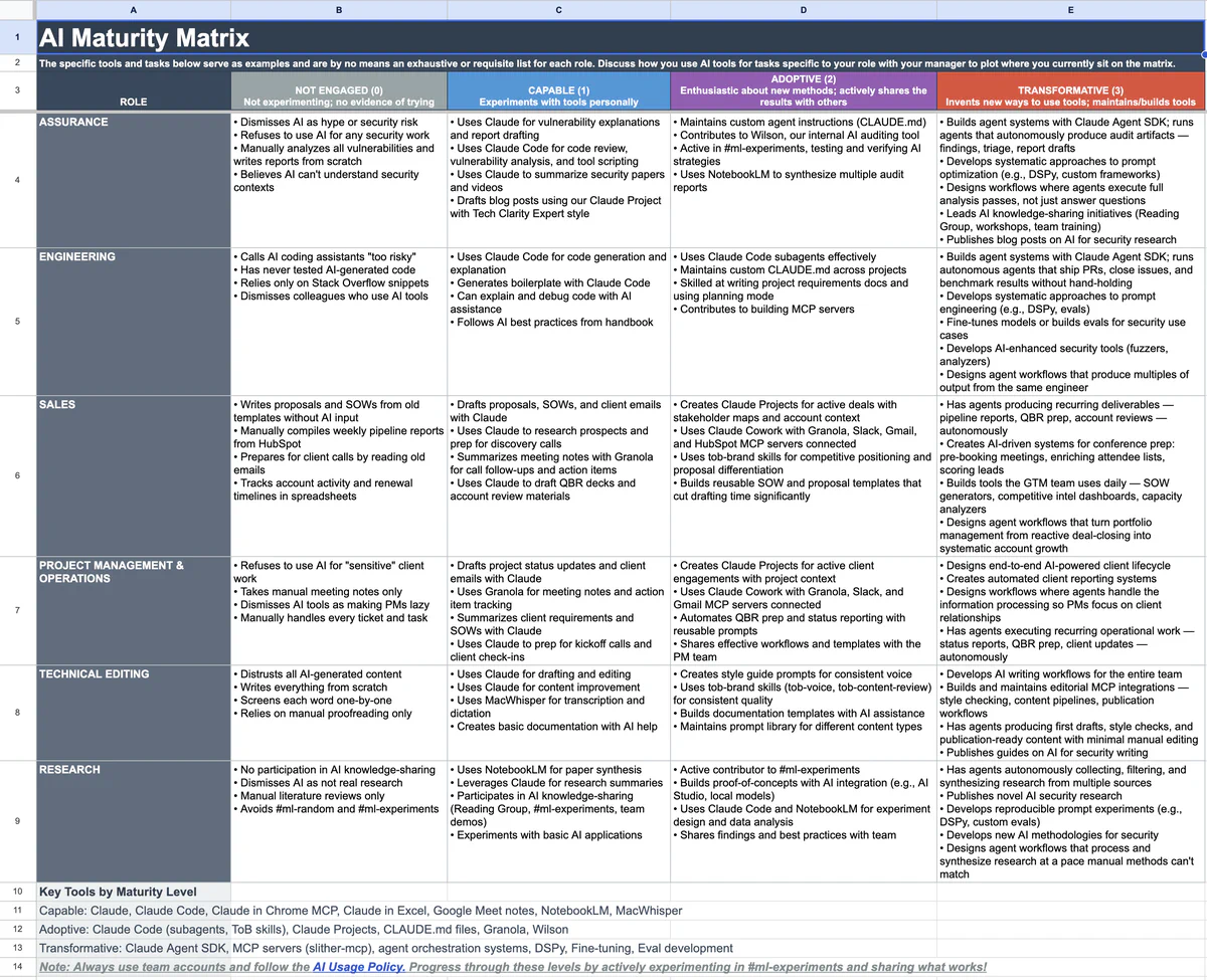 Why the gap? Most hand out ChatGPT logins and expect magic. Trail of Bits built a system. They distinguish three tiers: