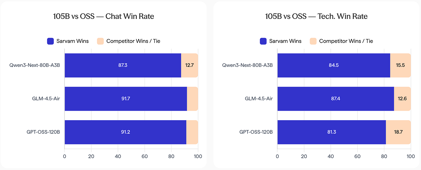 Sarvam AI, an Indian startup, dropped sarvam-105B (105B total, 10B active) and a 30B-A2B variant, trained on 12-16 trillion tokens heavy in Indic languages. They outperform Llama-3.1-70B and Qwen2.5-72B on Hindi, Tamil, and Bengali benchmarks by 10-25% preference scores. This underscores sovereign AI: Western models hallucinate or bias on non-English data, while Sarvam integrates cultural nuance. India, with 1.4 billion people and 22 official languages, needs this; global firms ignore it at their peril. Expect similar pushes from Brazil or Indonesia soon.