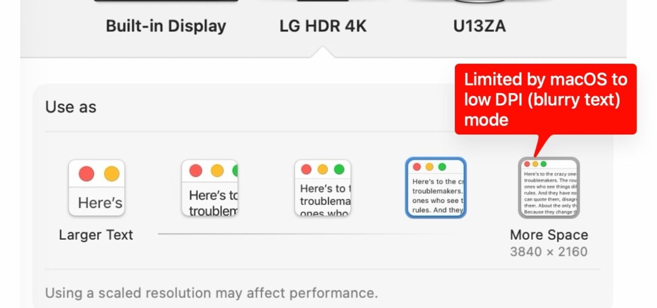 Workarounds exist, but falter on M4. Force timings with SwitchResX ($20 lifetime)—injects CVT-RB timings for 3840×2160@60Hz HiDPI—but M4 firmware blocks them, risking black screens. Better displays help: LG 27UP850 or Samsung ViewFinity S9 negotiate HiDPI natively via DP 1.4. Drop to 30Hz: tolerable for static work, stuttery for scrolling. Dual-monitor setups? M4 base supports one external; Pro/Max hit two 6K60, but 4K still gimped. Long-term, watch macOS 15.2—software might patch if not hardwired. Skeptical take: Apple’s internal Retina obsession prioritizes laptop screens; externals remain afterthought, herding users into ecosystem lock-in.