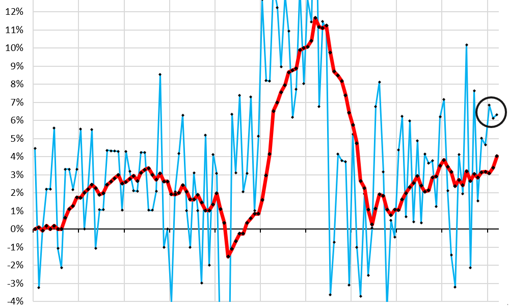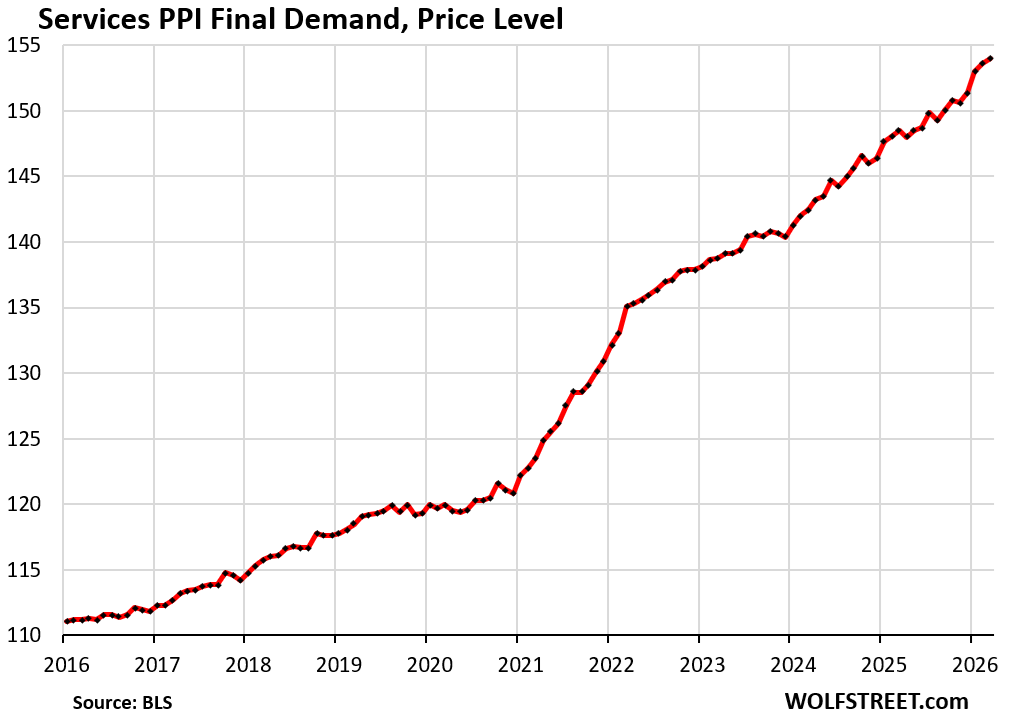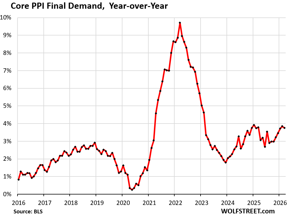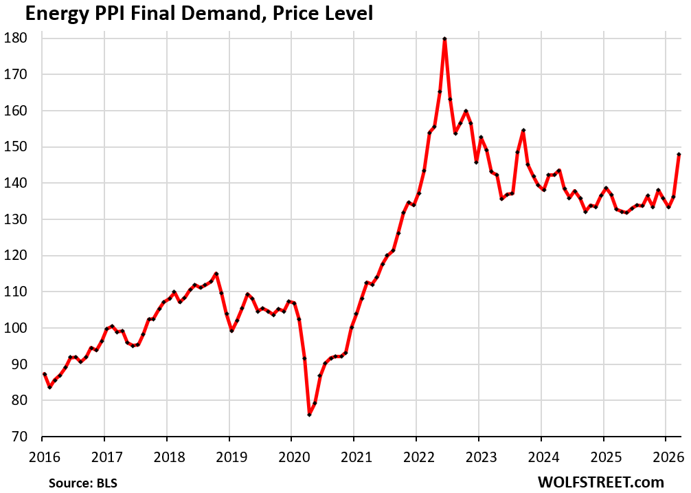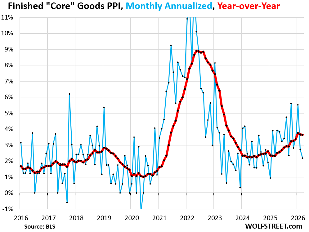 The surge would have been worse without counterbalances. Energy prices spiked 8.5% month-to-month (165% annualized), pushing the year-over-year gain to 11.2% from a decline last month. Yet food prices for producers dropped 0.27%, and services—68% of the overall PPI—edged up just 0.05% (0.6% annualized). Trade services, 19% of the total PPI, fell 0.3% for the second straight month after January and December spikes.