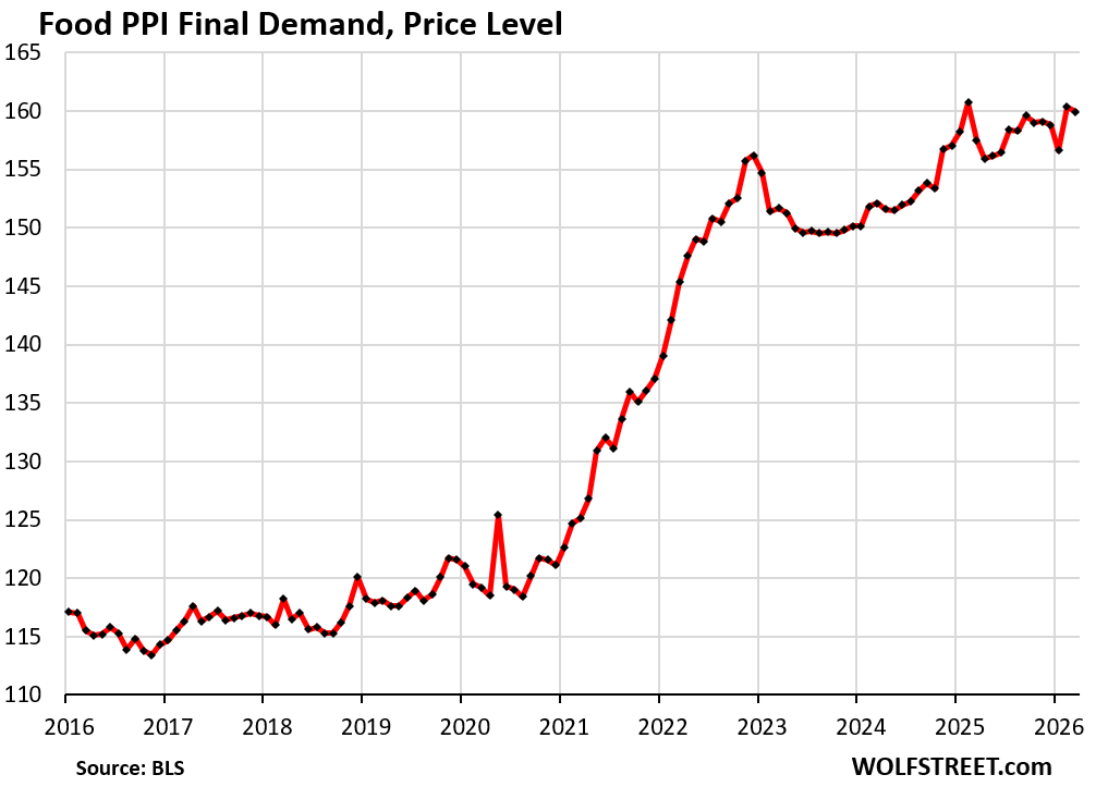 Food PPI fell 0.27% after February’s 2.39% spike and January’s plunge. Year-over-year, it reached 1.5%. The price index sits 33% above mid-2020 lows but has plateaued, bumping a ceiling. Commodity volatility from weather, Ukraine war exports, and U.S. farm output explains the chop.