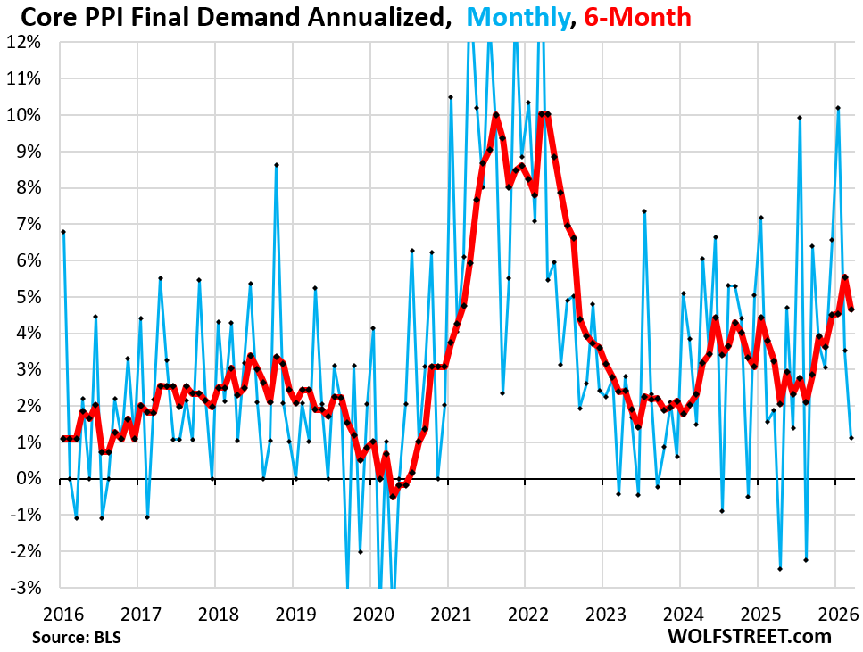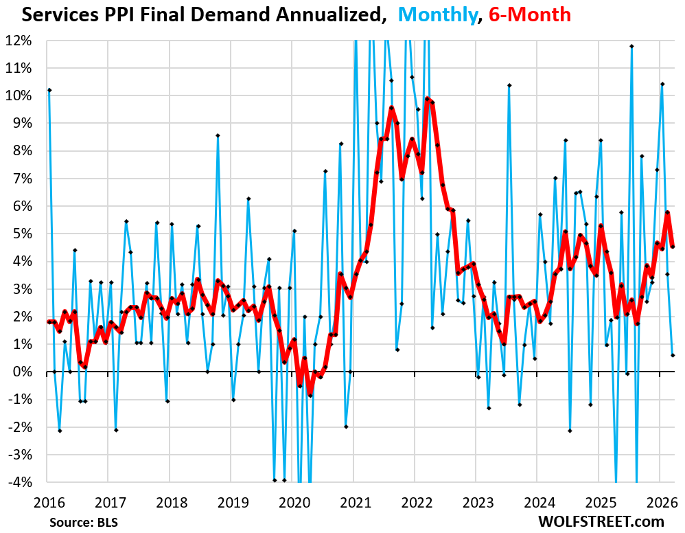Services PPI, the PPI heavyweight at 68%, stalled after three months of acceleration. Its six-month annualized rate eased to 4.6% from February’s 5.8%, the highest since August 2022. Trade services’ decline—retail margins and wholesale costs—pulled it lower. Without this flat reading, March’s overall PPI would have exploded higher.