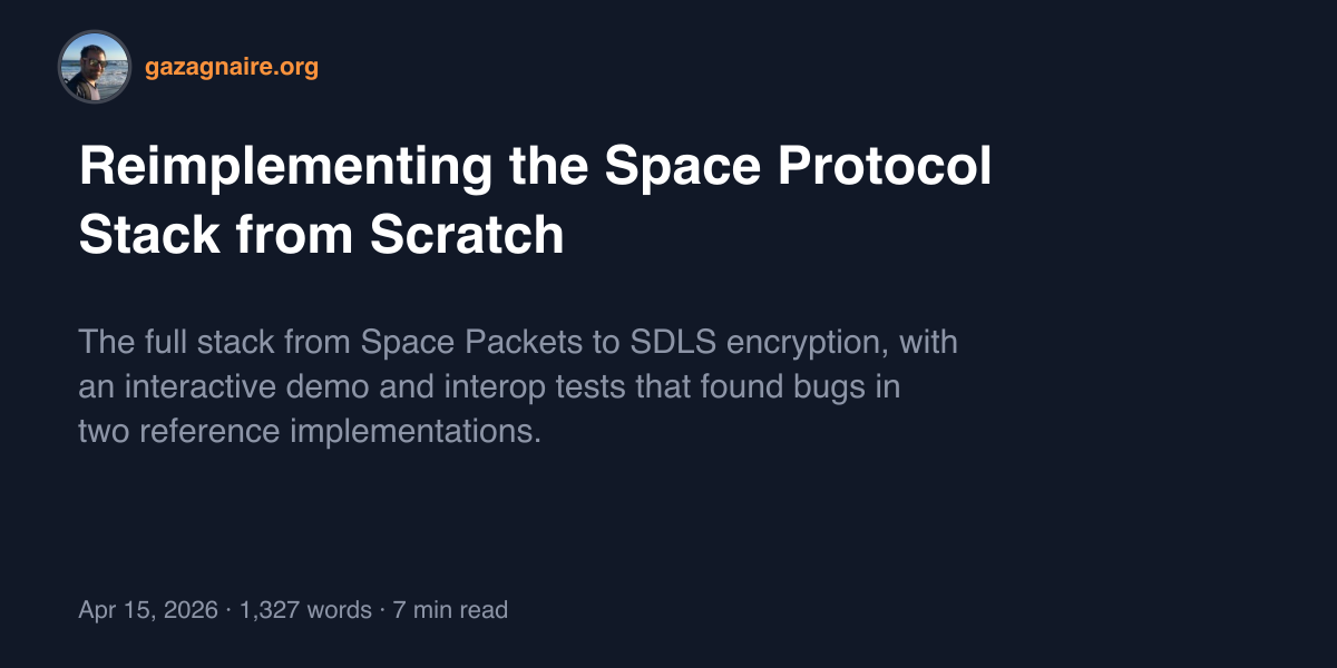 Satellites move at 7.5 km/s relative to ground stations. Passes last 10 minutes. Bandwidth tops out at kilobits per second. Standard protocols must handle this without room for error. Enter CCSDS, the Consultative Committee for Space Data Systems standards suite. Since 1982, NASA, ESA, JAXA, and others have maintained it. Nearly every satellite launched in the last 30 years uses some CCSDS subset. Proprietary C libraries dominate implementations, locked inside ground station software. An independent developer reimplemented key parts in OCaml, with typed binary codecs, to run in browsers. You can now encode telemetry frames client-side, inspect bytes, and simulate satellite transmissions.