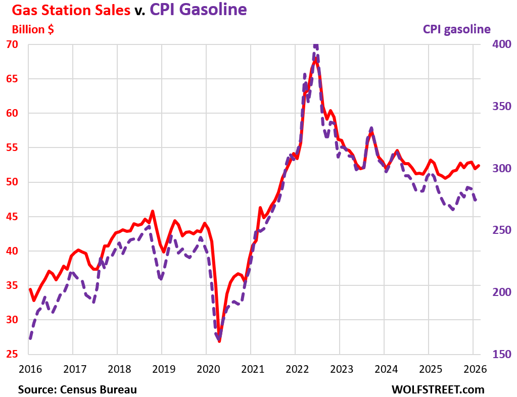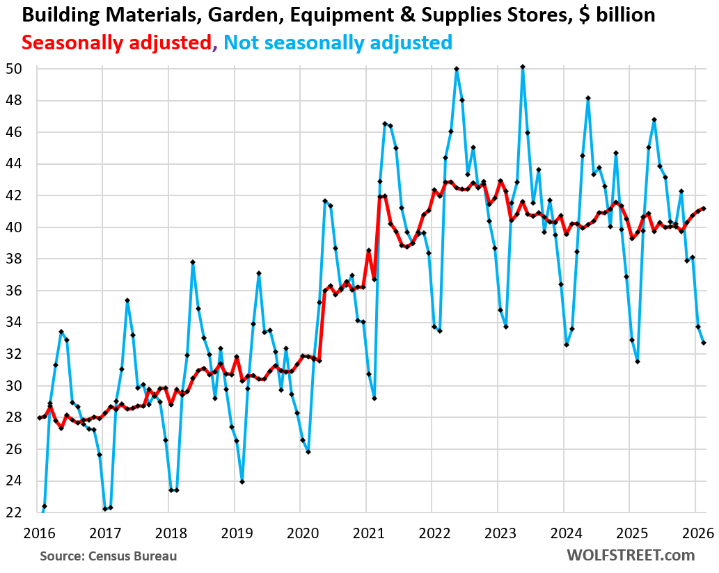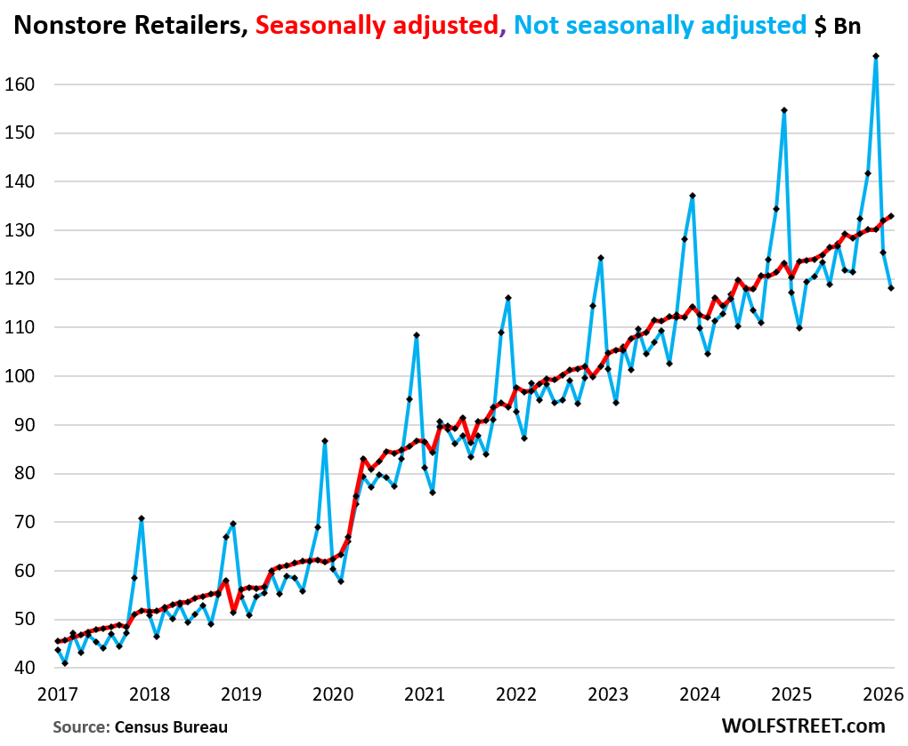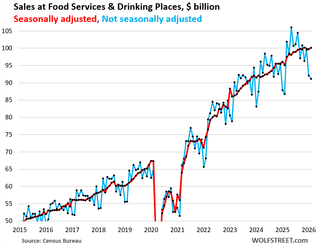 Restaurants and bars (food services, 12% share) edged up 0.4% adjusted to $100 billion, 5% year-over-year. Unadjusted dipped 1.1% to $91 billion. Consumers prioritize experiences over stuff, even as menus inflate.