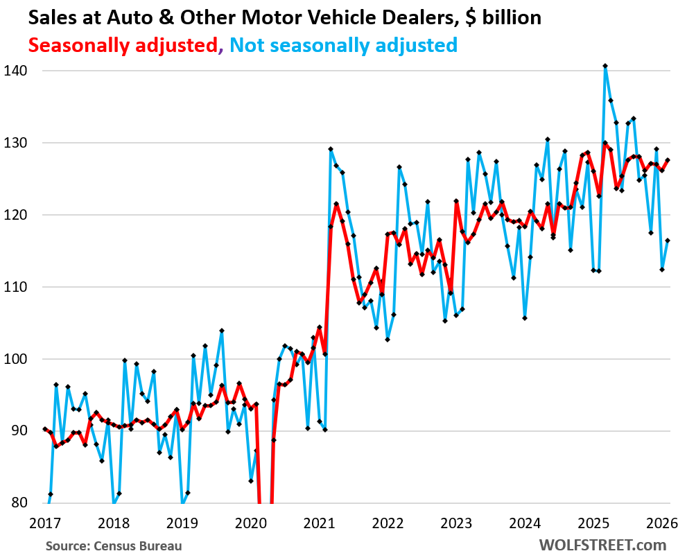 Ecommerce and nonstore retailers, now 18% of total sales, grew 7.5% year-over-year to $133 billion adjusted. That’s double the pace of overall retail. Month-to-month, adjusted sales rose 0.7%; unadjusted fell 5.8% to $118 billion. Amazon and others keep grabbing bricks-and-mortar’s lunch. Autos, 16% of sales, climbed 1.2% adjusted to $128 billion, up 3.7% year-over-year. Unadjusted, they gained 3.6% to $116 billion—steady demand despite high rates and prices averaging $48,000.