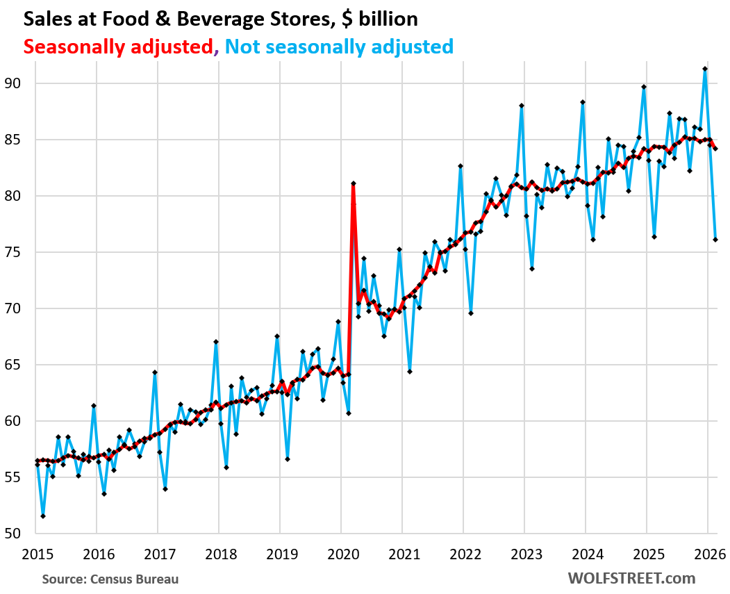 Here’s the outlier: food and beverage stores (11% share) dropped 1.1% adjusted to $84 billion, and cratered 9.9% unadjusted to $76 billion. Year-over-year, sales fell 0.3%—first decline in months. Normal February slumps hover around 5-7% unadjusted; this exceeded that. Supermarkets like Kroger and Walmart grocery aisles took the hit.