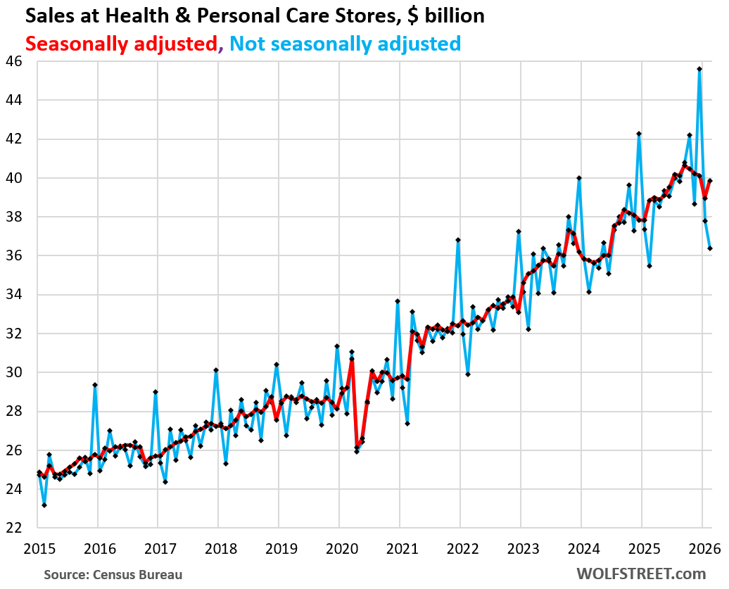 US retail sales hit a record $738 billion in February, up 0.6% from January on a seasonally adjusted basis. Strip away the adjustments, and sales plunged 3.1% to $653 billion—the lowest since last February. Year-over-year, both measures grew 3.7%, beating goods inflation by a wide margin. This pattern repeats annually: December spikes from holiday buying, January and February slump from returns and weather. The Census Bureau’s adjustments aim to smooth it out, but they introduce noise. Over 12 months, these factors net to zero, so one month’s boost means another’s cut.