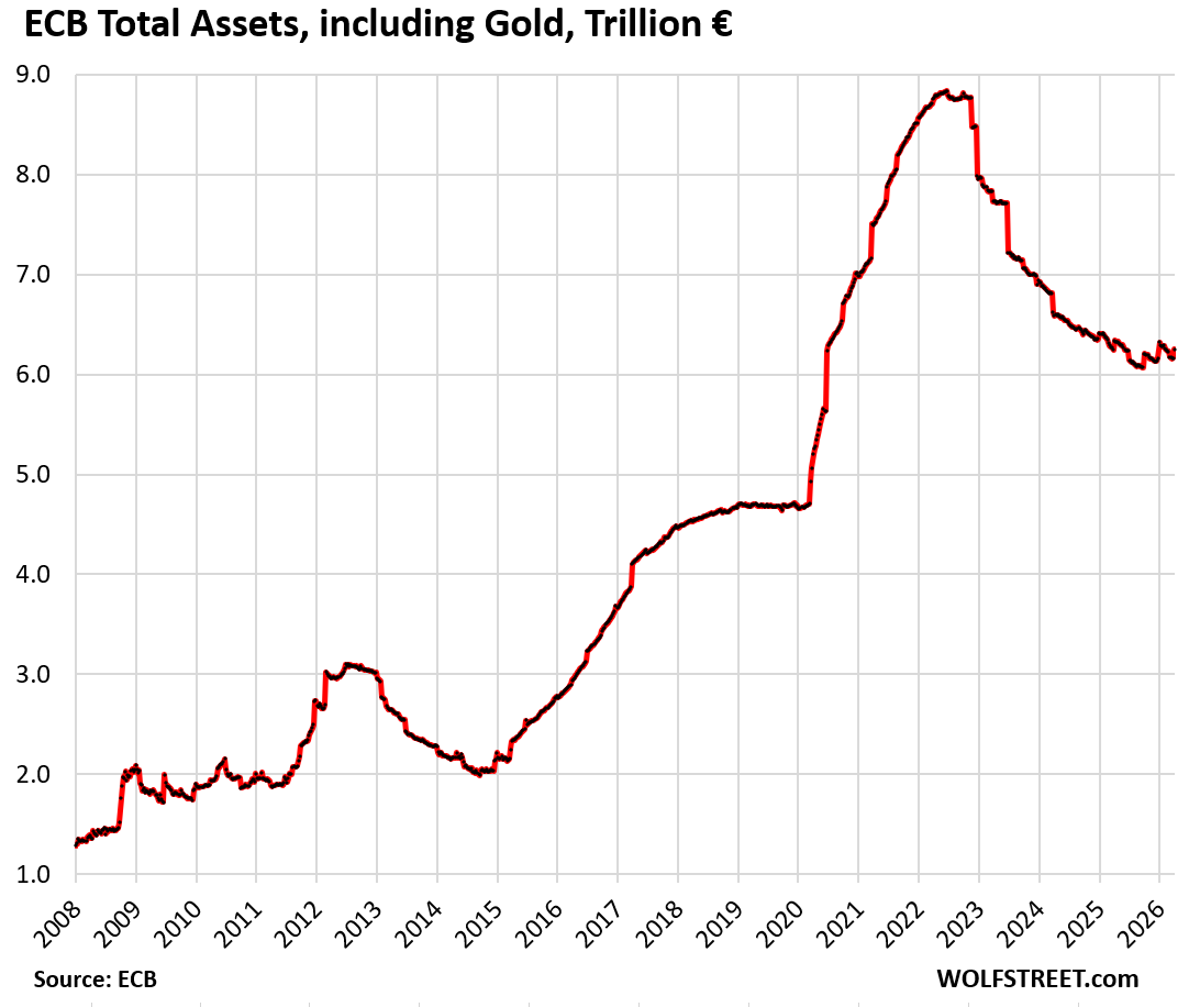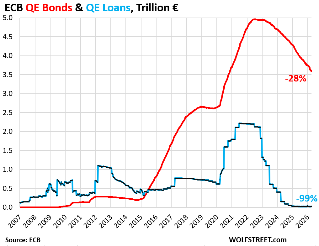 Break it down: QE bloated the ECB’s balance sheet through two channels—loans to banks and outright bond purchases. Loans peaked at €2.2 trillion; the ECB killed them off by 99% through unattractive repayment terms that banks rushed to escape. Bonds, mostly government debt from eurozone states plus some corporates and securitized assets, dropped 28% from €4.96 trillion to €3.59 trillion. These mature naturally now, with no reinvestments since early 2025 caps vanished. The ECB’s balance sheet today stands at €6.25 trillion after this month’s purge.