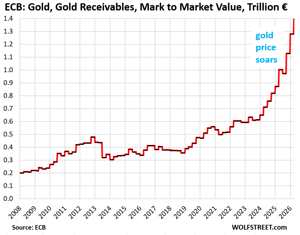 Offsetting QT shrinkage, the ECB marked its gold holdings to market quarterly—unlike the Fed’s annual tweaks. Q1 saw a €113 billion uplift to €1.39 trillion, driven by gold’s euro price climb after January’s rally and February’s dip. Over five quarters, mark-ups totaled huge gains; since mid-2019, nearly €1 trillion in paper profits as gold surged from geopolitical tensions, de-dollarization bets, and central bank hoarding.