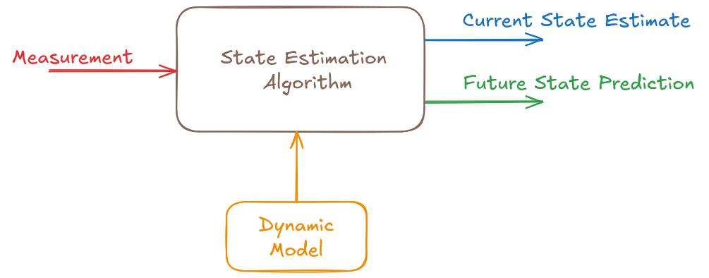 Picture a radar station at (0,0) pinging a plane flying straight at constant velocity. State vector: [x, vx, y, vy]—position and speed in 2D. Radar measures range r = sqrt(x^2 + y^2) and bearing θ = atan2(y,x), both corrupted by noise, say 10m range error and 0.1 rad angle noise.