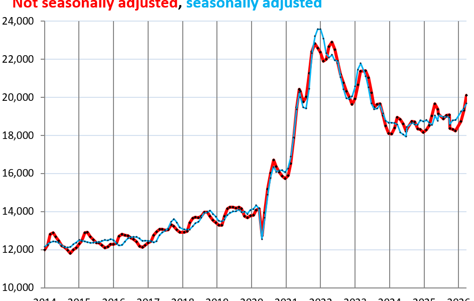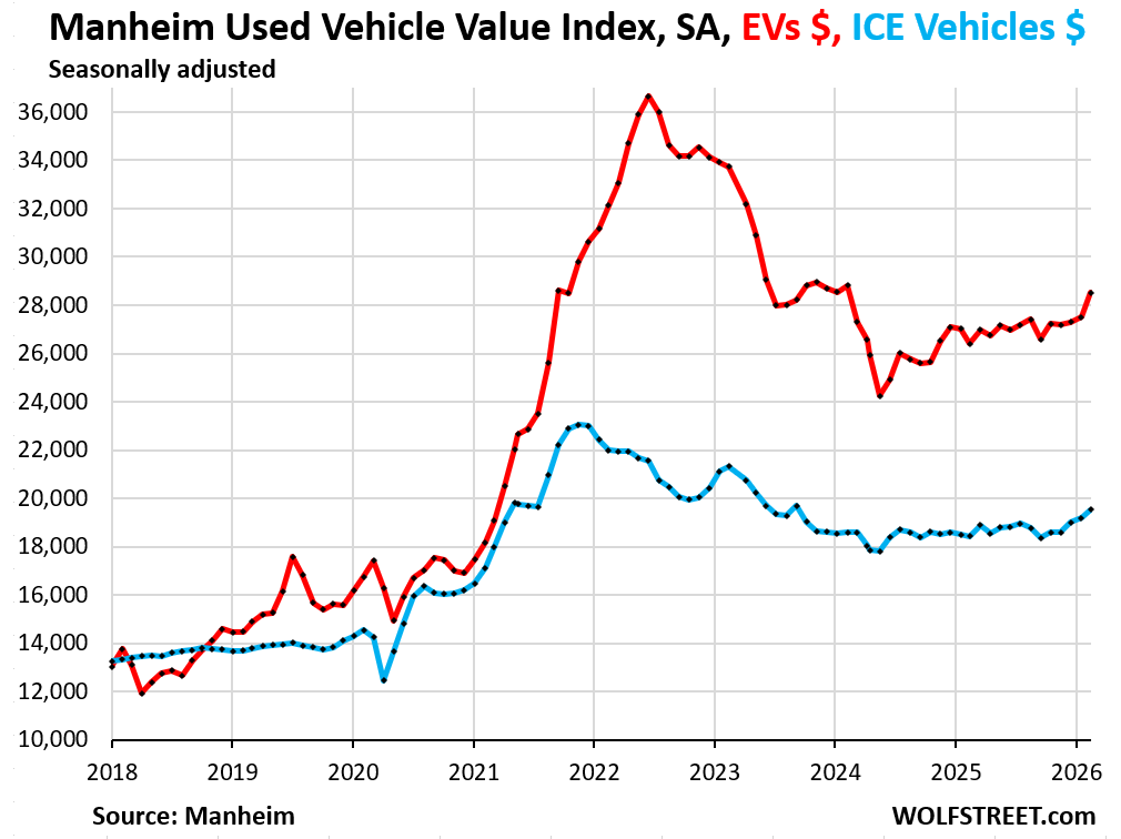 Wholesale prices for used vehicles surged 4.2% in March from February, not seasonally adjusted, hitting $20,102 per unit. That’s the sharpest monthly jump since the pandemic-era spike that kicked off broad inflation in 2020. Year-over-year, prices rose 5.7%. Seasonally adjusted, the Manheim Used Vehicle Value Index (MUVVI) climbed 1.4% month-over-month. Manheim, the biggest U.S. auto auction operator under Cox Automotive, tracks these dealer-to-dealer sales, which signal retail trends ahead of time.