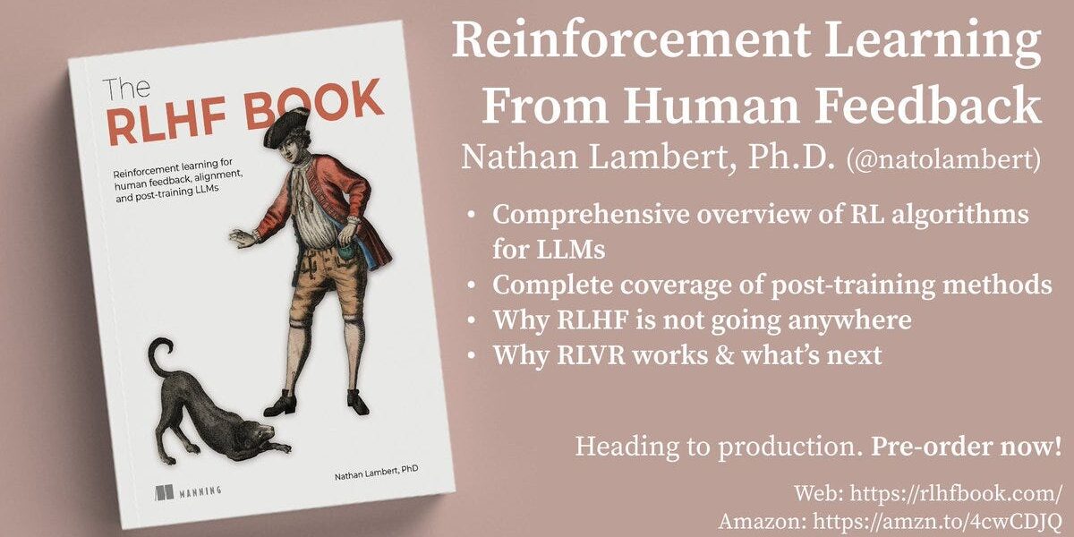 Lambert finished his RLHF book after starting seriously in May 2024. Sent to Manning for production last week (as of April 2026), it hits print in two months. Pre-order now on Amazon or Manning—the latter’s cheaper. Aimed at bridging beginner-to-expert in post-training (RLHF, DPO, etc.), it fills a void as base models commoditize. No fluff: This is the handbook he wanted when diving in.